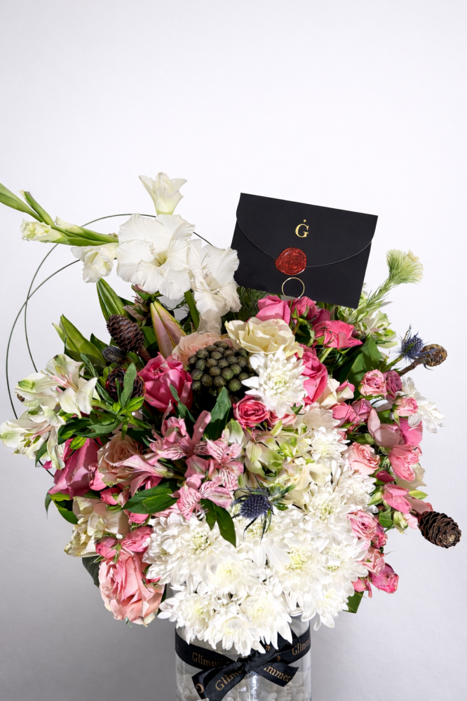 مزيج متناغم من الوردي الناعم، الأبيض النقي، ولمسات خضراء طبيعية تمنح الباقة عمق وشخصية مختلفة. تنسيق مليان تفاصيل — ورود متفتحة، أزهار دقيقة، وعناصر طبيعية تضيف طابع أنيق وغير تقليدي.